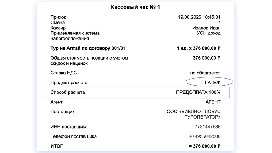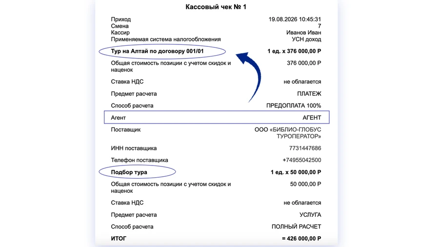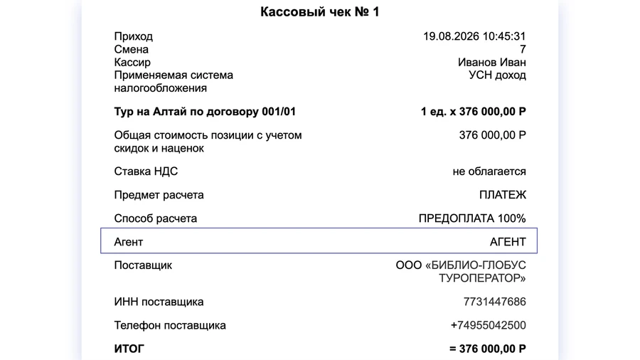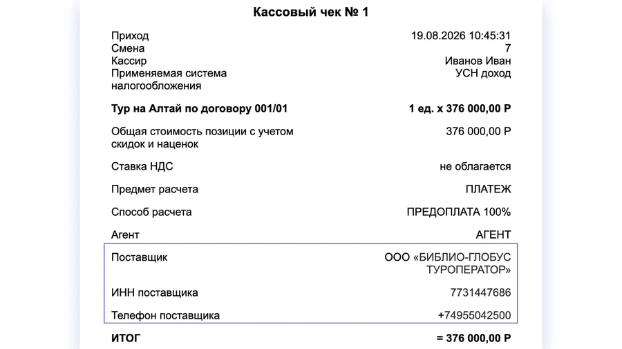 Если в чеке указан признак агента, автоматически возникает обязанность указать сведения о поставщике услуги – туроператоре: