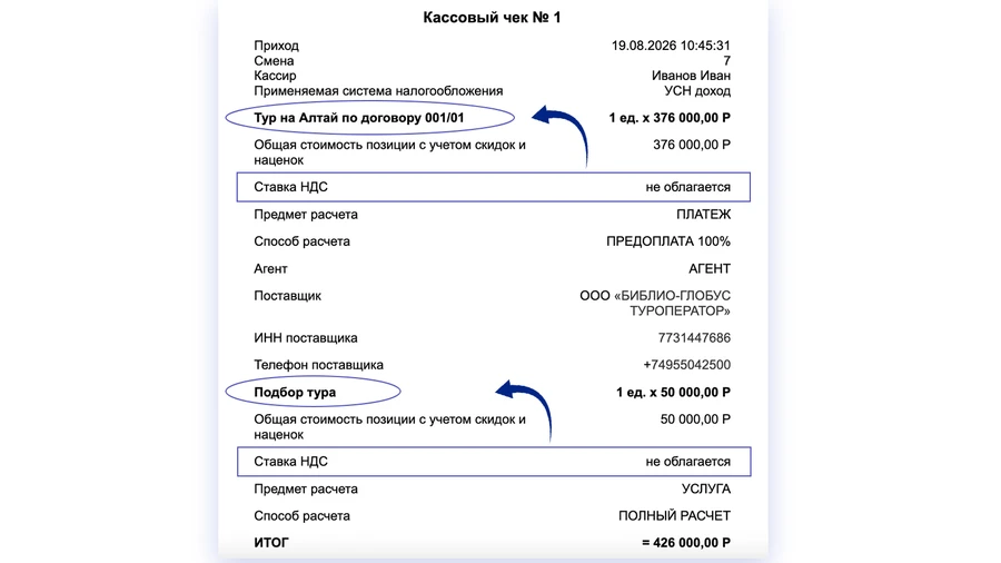 2. Агентское вознаграждение уплачивается клиентом отдельно. В чеке оно выделяется отдельной строкой. Для позиций указываются соответствующие ставки НДС: ставка туроператора для тура и ставка агента для вознаграждения.