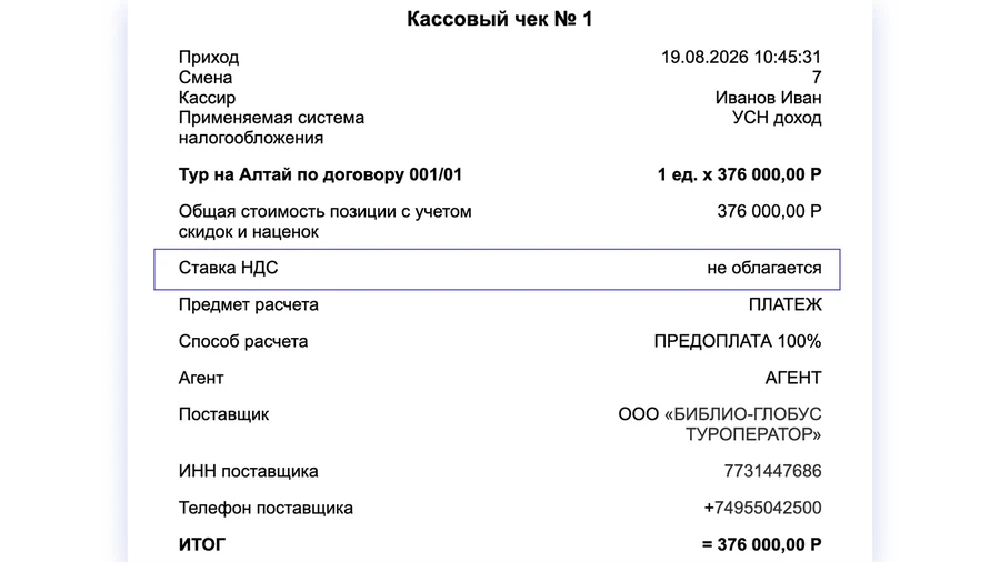 Если туроператор (принципал) не уплачивает НДС, то и в чеке будет отражаться строка «НДС не облагается». Это правило работает, даже если сам агент является плательщиком НДС.