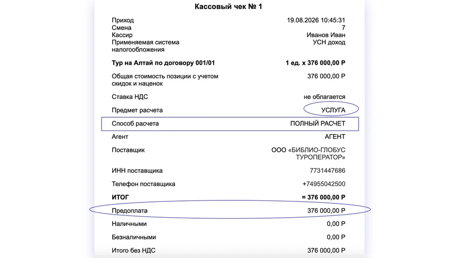 В случаях, когда покупатель оплачивает частями до начала тура, чек на частичную предоплату выдается каждый раз в момент расчета.