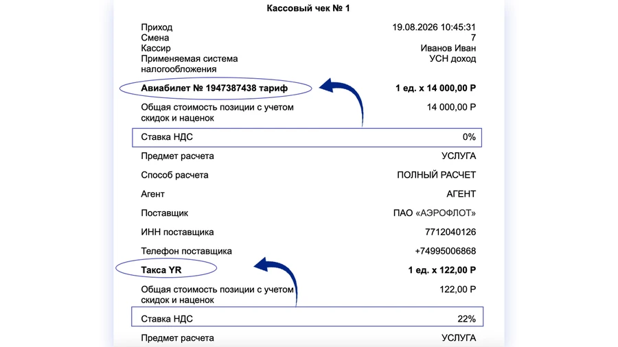 Общее правило: у каждой позиции в чеке указывается тот НДС, который относится конкретно к ней. То есть при реализации тура от лица туроператора именно его ставку необходимо указать в чеке для клиента, даже если она отличается от ставки, уплачиваемой агентом.