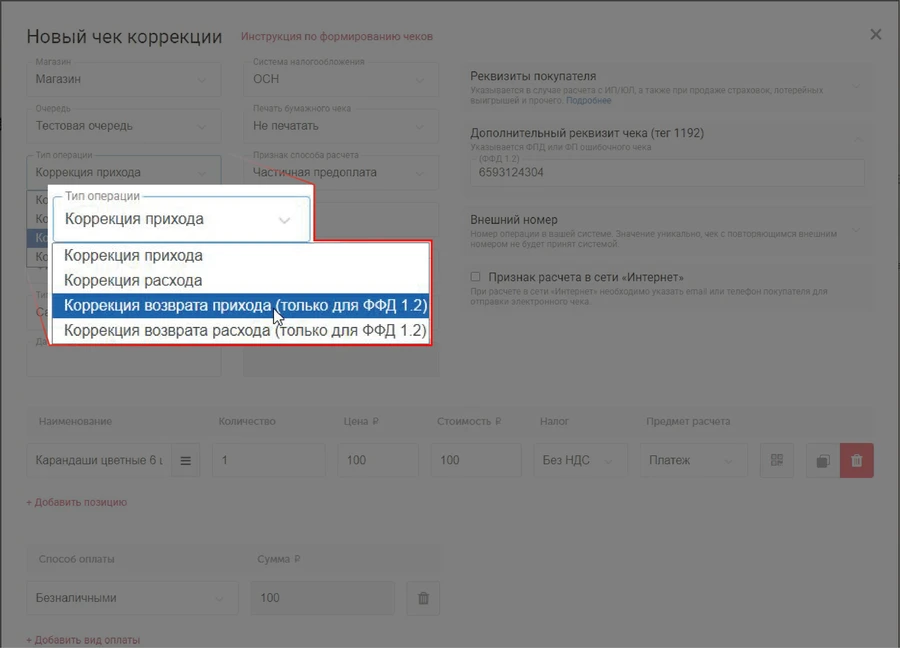 Для ФФД 1.2 необходимо создать чек Коррекции возврата прихода. Для этого, в момент заполнения формы Новый чек коррекции, в поле Тип операции укажите Коррекция возврата прихода.