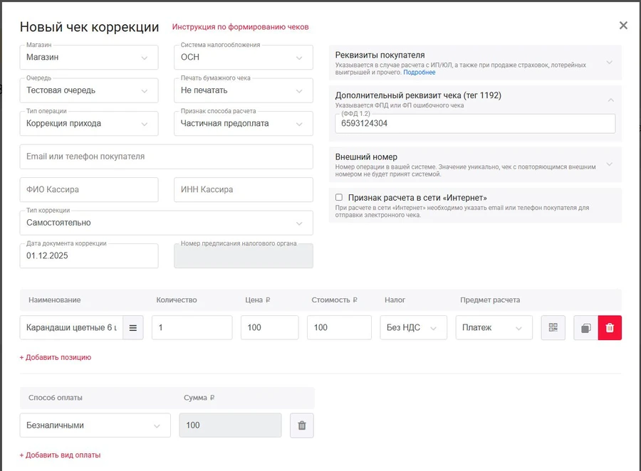 Параметр Значение Тип коррекции Самостоятельно или По предписанию (указывается, если есть письменное предписание от ФНС) Дата документа коррекции ФФД 1.05 - текущая дата