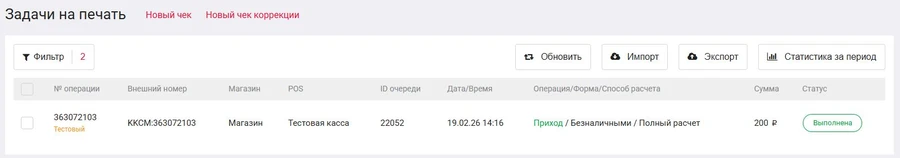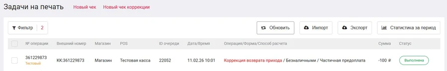 После этого сформируется новый чек с типом Возврат прихода и отрицательной суммой. Ваш ошибочная операция будет аннулирована.