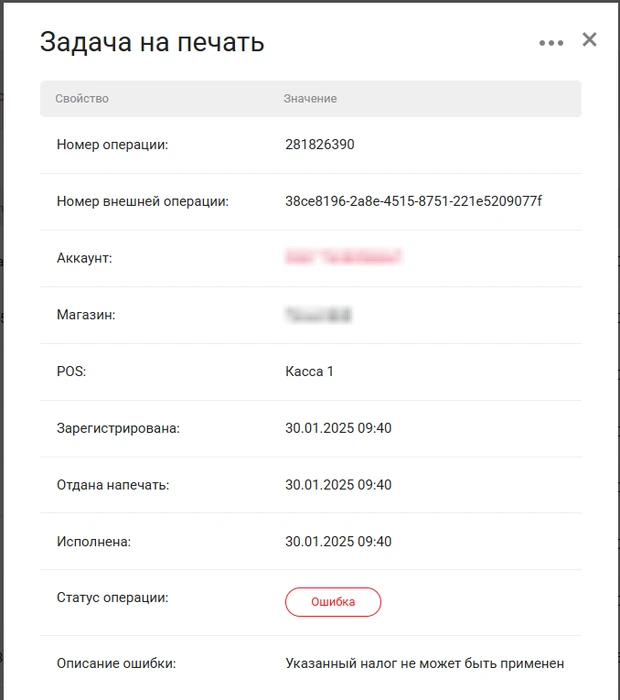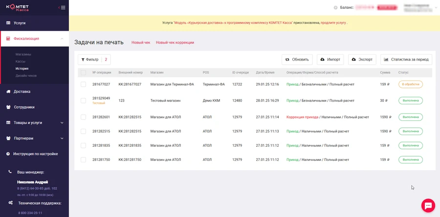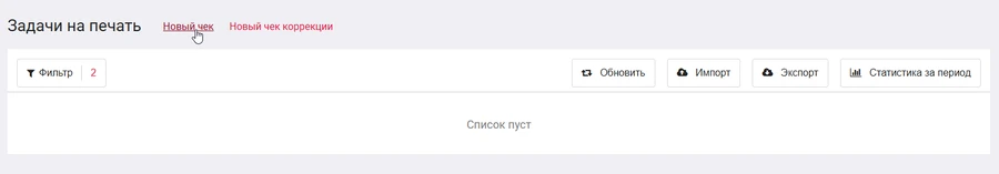 Статус чека Описание Новая Операция ожидает в очереди В обработке Операция фискализируется, то есть проходит обработку в кассовом аппарате Выполнена Операция успешно выполнена Ошибка При фискализации возникла ошибка. Описание ошибки можно получить, кликнув на операцию
