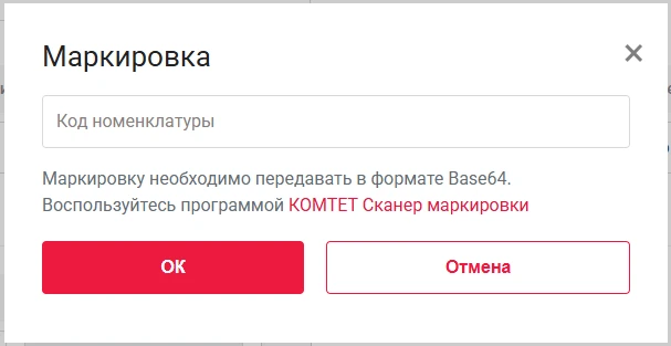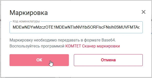 Маркировку необходимо передавать в формате Base64. Воспользуйтесь программой КОМТЕТ Сканер маркировки