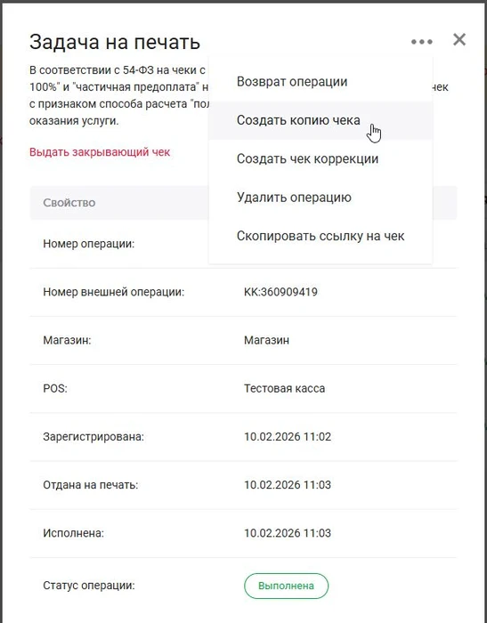 Если у вас уже есть сформированный чек в любом статусе и вам нужно провести его посторно или исправить какие-то параметры, вы можете быстро создать его копию. Для этого найдите операцию в личном кабинете в разделе Фискализация → История, далее кликните по операции. Откроется окно Задача на печать. Нажмите в нем три точки → Создать копию чека.