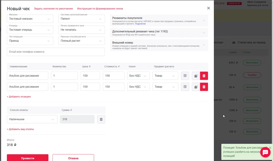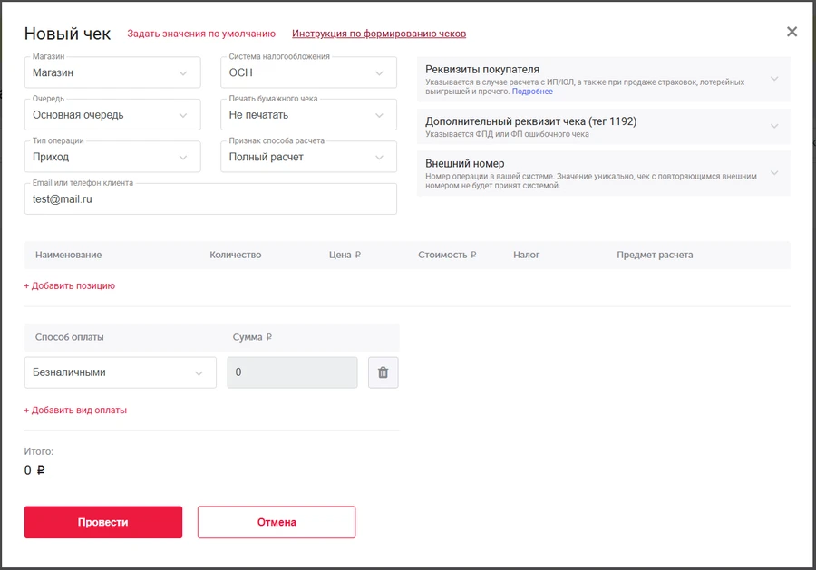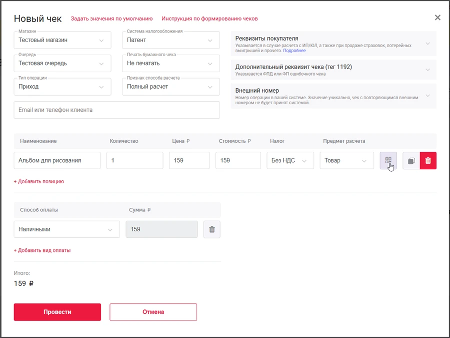 Если у вас есть вопросы по указанию верных параметров чека (Типа операции, Признака способа расчета или Способа оплаты), можете руководствоваться таблицей «Таблица значений реквизита “Признак способа расчета” (тег 1214)» или связаться с нашими специалистами технической поддержки и получить консультацию. - Нажмите кнопку Провести