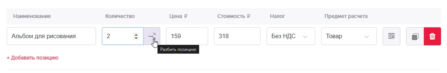 </i> - Позиция разбивается на несколько, затем отдельно в каждую позицию вводится код маркировки. При этом в правом нижнем углу вы увидите уведомление о разбиении позиции.