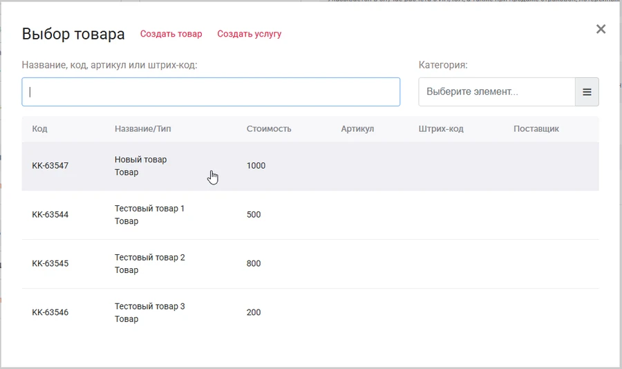 Если ранее вы не создавали позиции, вам нужно создать товар или услугу. После создания можно будет выбрать эту позицию сразу из каталога. - Выберите способ оплаты