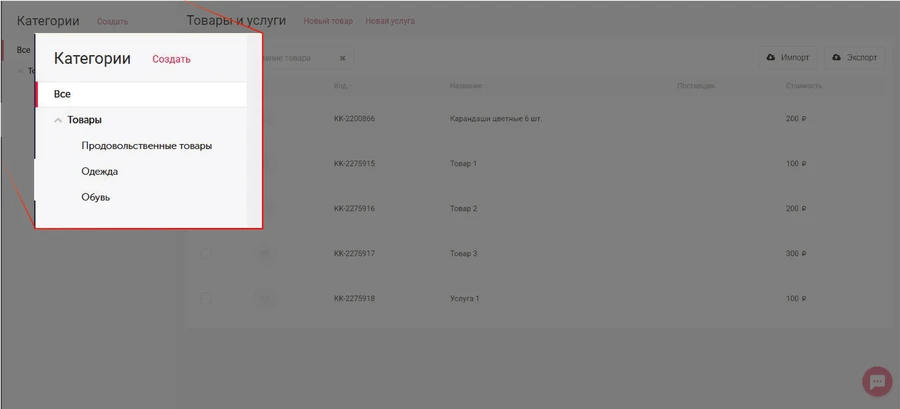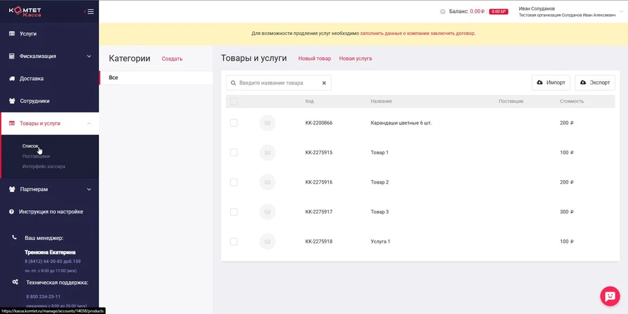 Раздел Товары и услуги в личном кабинете - центральный инструмент для управления вашей номенклуатурой в рамках нашего сервиса. Позиции созданные здесь, могут применяться при создании чеков, заказов, работе выездных сотрудников и курьеров в мобильном приложении. Если вы планируете работать через личный кабинет КОМТЕТ или мобильные приложения, обязательно заполните каталог своими товарами.