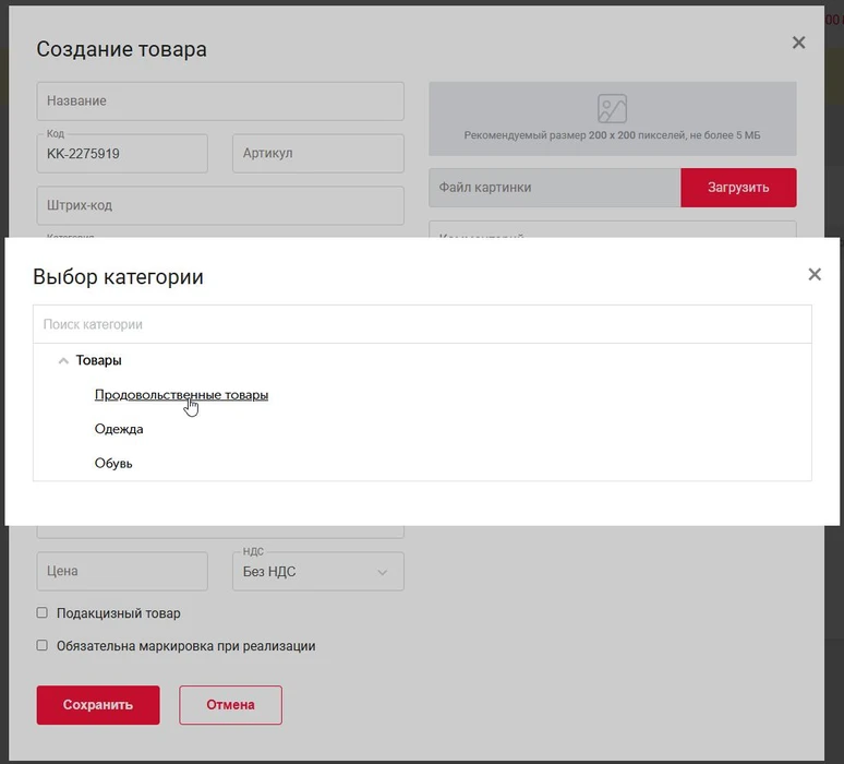 После нажатия на кнопку Новый товар откроется форма создания товара. Позиция будет автоматически передаваться в чек с тегом «Предмет расчета» - Товар