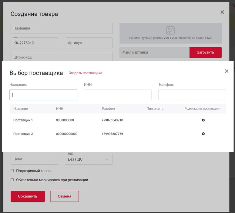 После добавления поставщика он станет доспупен для выбора при создании товара или услуги