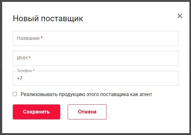 Если вы работаете по агентскому договору или вам требуется указывать ваших поставщиков в чеках, необходимо при создании товара указать данные поставщика. Для этого в разделе Товары и услуги → Поставщики создайте поставщиков. Для этого нажмите кнопку Новый поставщик и заполните все поля.