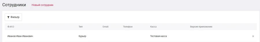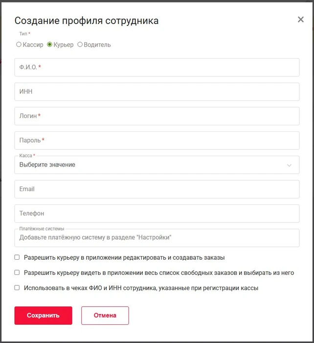 - Выберите тип сотрудника Курьер и заполните поля