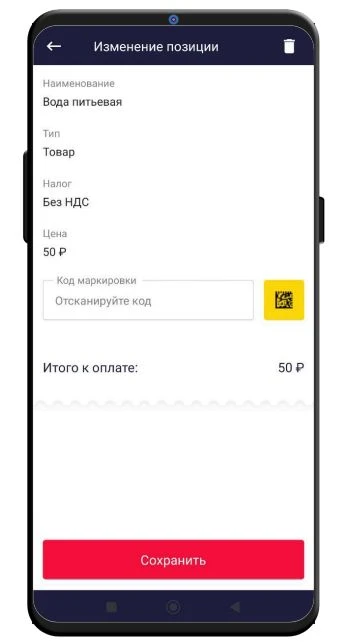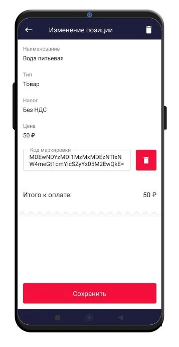 После считывания кода он отобразиться в поле Код маркировки. Для сохранения нажмите кнопку Сохранить.