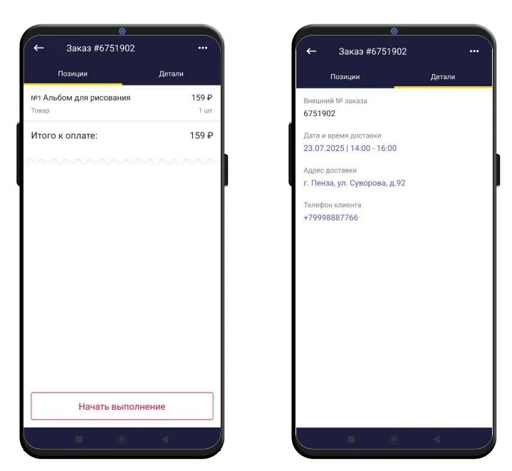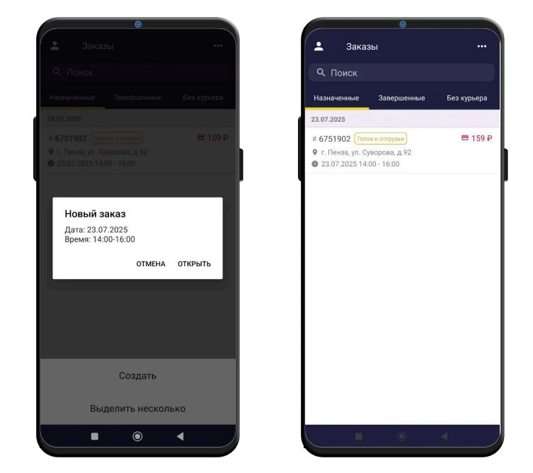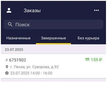 После назначения заказа курьеру в мобильном приложении придет уведомление, и заказ появится в разделе Назначенные.Наименование поля Описание Обязательность ФИО клиента Данные клиента, отображаются в деталях заказа в приложении Адрес доставки Адрес доставки, отображается в деталях заказа в приложении