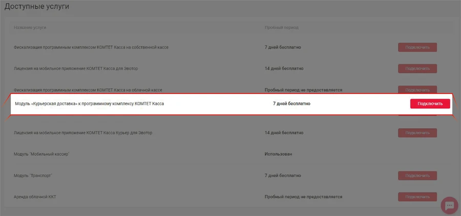 - Перейдите в раздел Услуги и подключите Модуль "Мобильный кассир"
