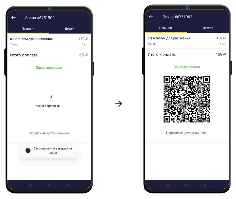 После оплаты отправляется запрос на формирование чека. По завершении фискализации отобразится QR-код