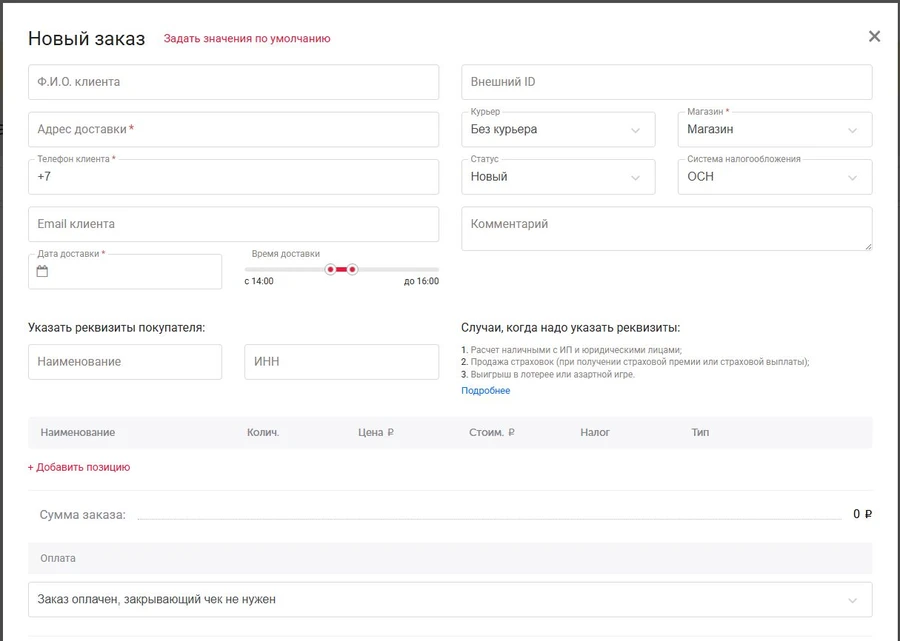 При нажатии кнопки Новый заказ откроется форма заказа. Заполните все необходимые поля. Если требуется