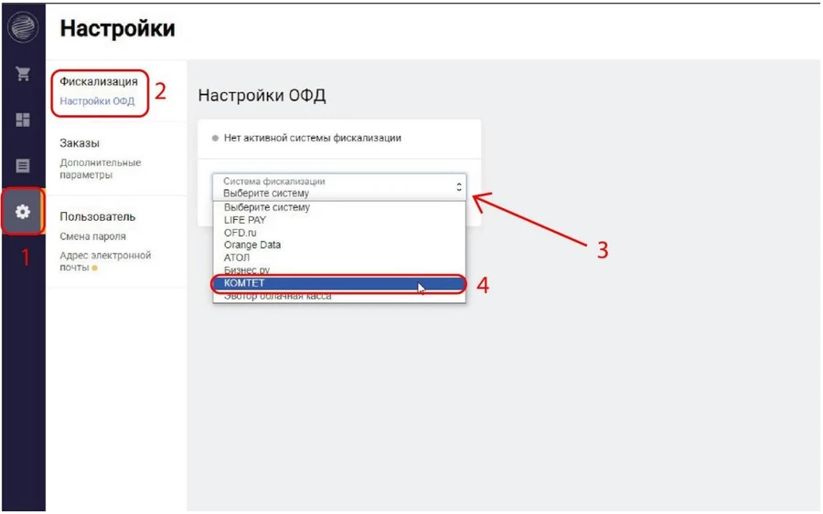 - Перейдите в раздел Настройки → Фискализация → Настройка ОФД, выберите систему фискализации - КОМТЕТ