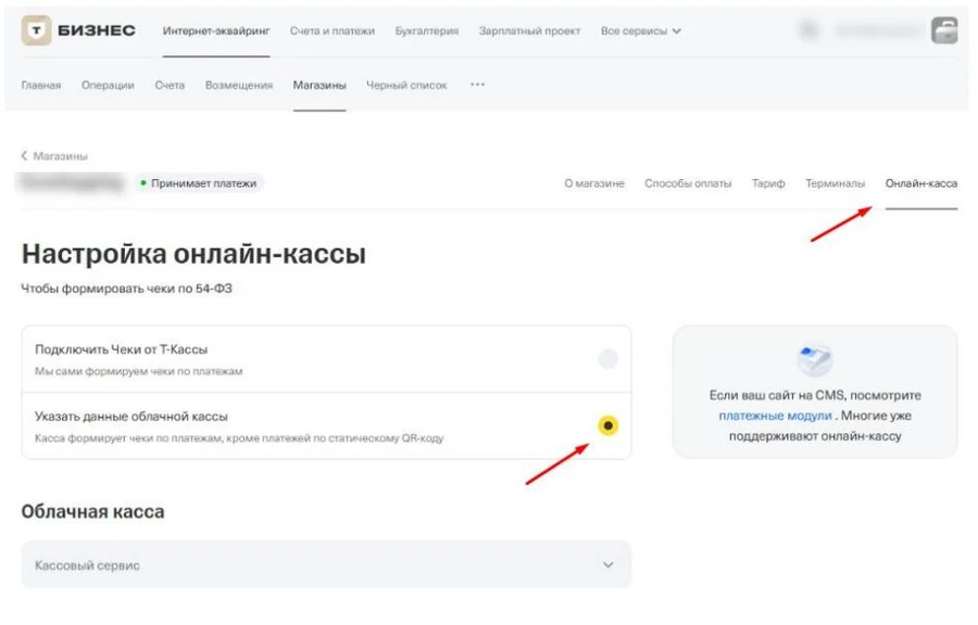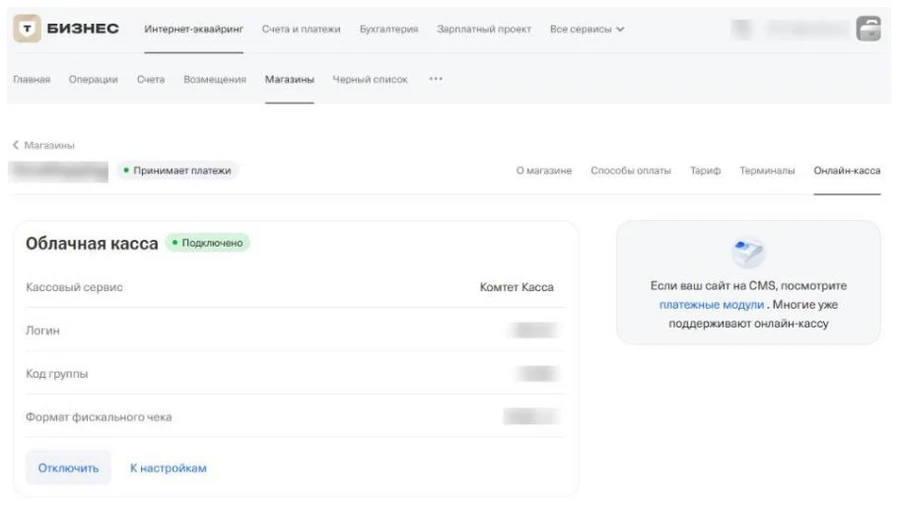 - Нажмите кнопку Cохранить. После сохранения настроек статус магазина в разделе Онлайн-касса сменится на Подключено.