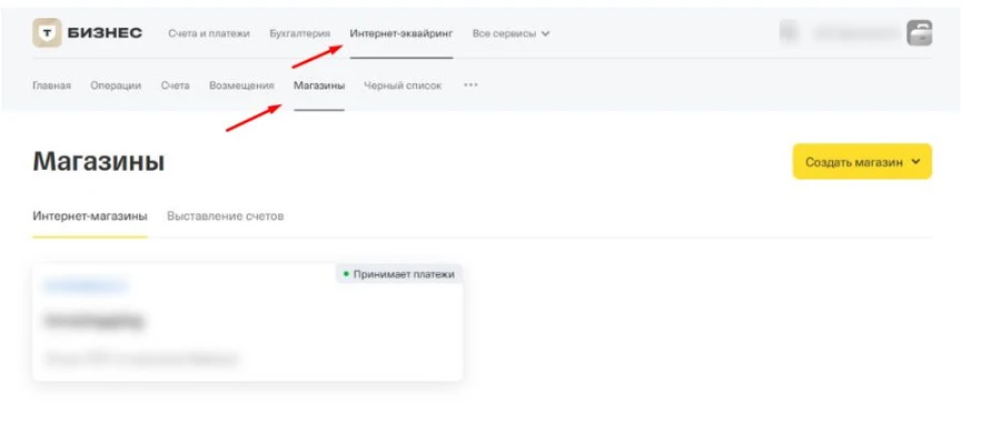 - Перейдите в личном кабинете Т-бизнес в раздел Интернет-эквайринг → Магазины. Выберите магазин, с которым будет настроена интеграция.