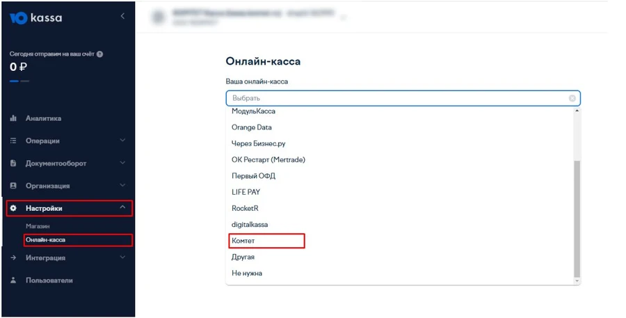 - Перейдите в раздел Настройки → Онлайн-касса, выберите онлайн-кассу - КОМТЕТ
