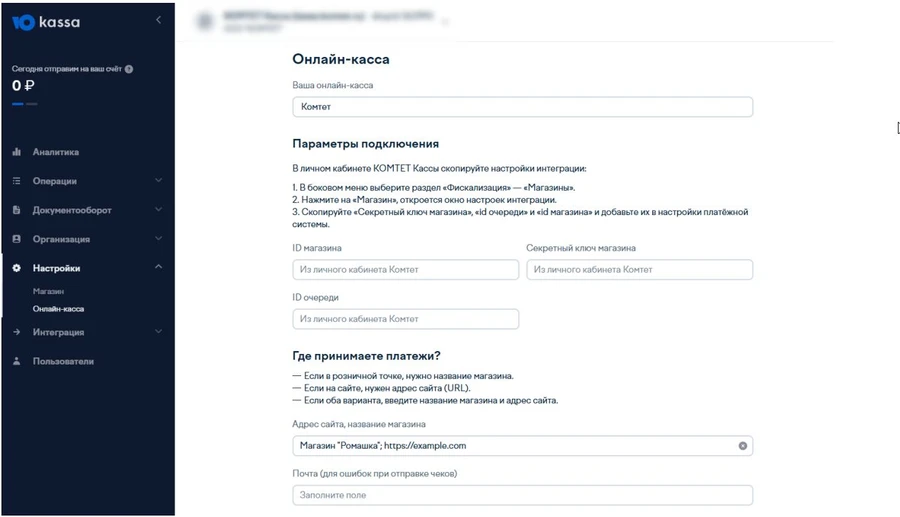 Название Описание ID магазина ID магазина из личного кабинета КОМТЕТ раздел Фискализация → Магазины Секретный ключ Секретный ключ из личного кабинета КОМТЕТ раздел Фискализация → Магазины ID очереди ID очереди из личного кабинета КОМТЕТ раздел Фискализация → Магазины (нужно кликнуть по магазину и выбрать подключенную очередь) Адрес сайта, название вашего маназина Ссылка на публичную старницу организации (сайт, сообщество ВК, Телеграм и т.д.) и через запятую название вашего магазина. Почта Контактный email - После заполнения полей нажмите кнопку Применить.