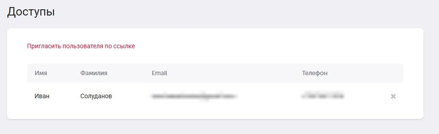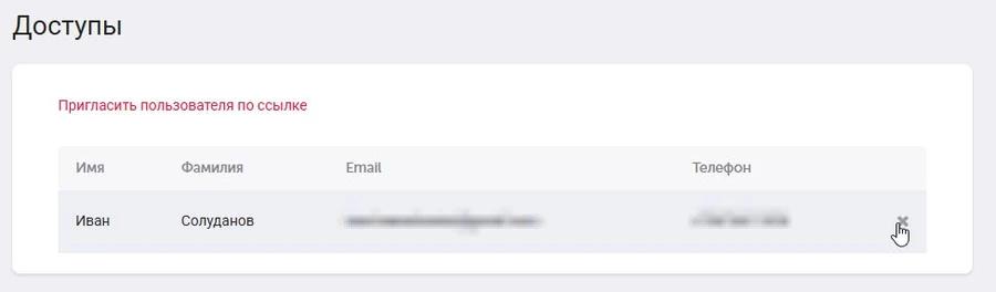 Иногда требуется удалить доступ, например если сотрудник уволился или доступ больше не требуется. Для этого в разделе Доступы вы можете нажать на крестик рядом с пользователем. Удаление автоматически отвяжет сотрудника от вашей компании и он не сможет в нее войти.