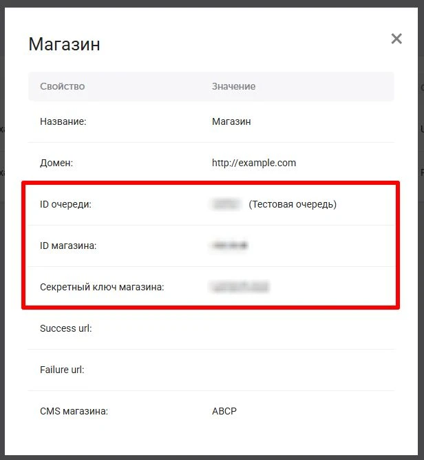 Когда магазин и очередь настроены, можно получить данные для интеграции. Перейдите в раздел Фискализация -> Магазины и кликните по нужному магазину. Откроется окно с данными магазина. Вам нужно скопировать поля ID магазина (логин), Секретный ключ (пароль), ID очереди (код группы). Эти данный вносятся во внешнюю систему или передаются службе технической поддержки платформы.