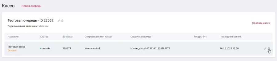 - Если у вас создана Тестовая касса и вы планируете только тестировать интеграцию, то дополнительно ничего редактировать в данном разделе не нужно. Перейдите к настройке интеграции. Если вы хотите сразу подключить боевую кассу, то удалите из очереди тестовую кассу (значек корзины в после с кассой).