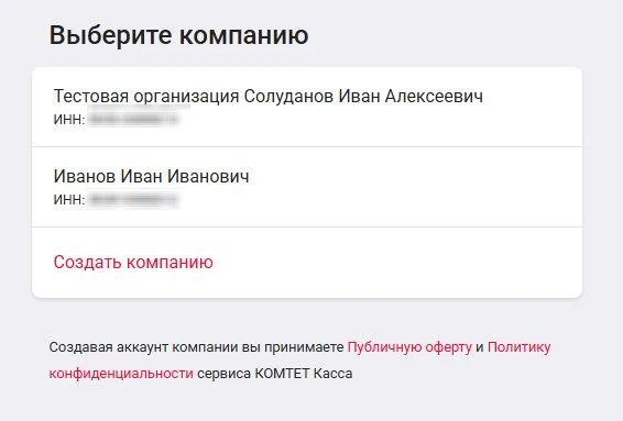 Вы увидите список ваших компаний. Если другая компания уже создана и привязана к вашему аккаунту КОМТЕТ ID, она отобразится в списке. Для перехода в нее просто кликните по названию компании. Если компания еще не создана, нажмите Создать компанию. После создания, она так же отобразится в списке.