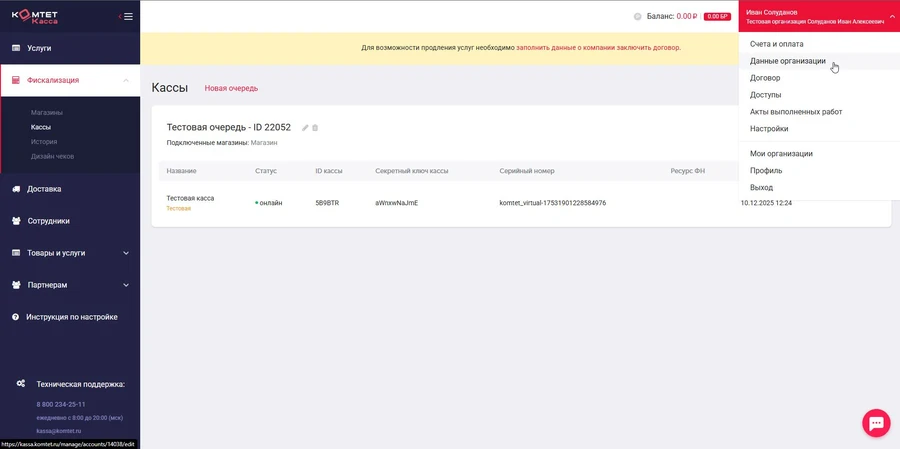 Данные организации используются для выставления счетов, создания актов сверки, подписи документов. В случае любых изменений направляйте уведомление в письменном виде специалистам технической поддержки или вашему персональному менеджеру на почту kassa@komtet.ru или в чате на сайте.