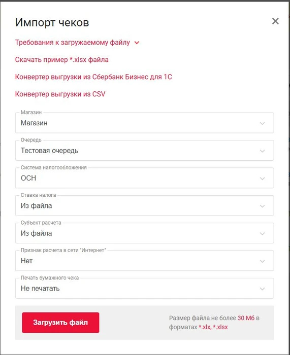 Данная функция позволяет загрузить реестр чеков объемом до 5 000 операций. Сформировать его можно, опираясь на выгрузку из банка или вашей CRM-системы. Вы можете указать схожие параметры для всех чеков, что сильно успростит создание рееста.