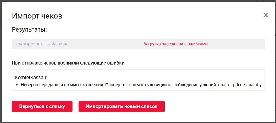 Если какие-либо поля были заполненны некорректно, при загрузке файла выйдет ошибка. Дополнительно вы увидите ID внешней системы операций с ошибками и описание ошибки.