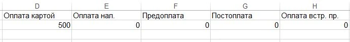 - Для полей Оплата картой, Оплата нал., Предоплата, Постоплата, Оплата встр. пр.. обязательно заполнение только одного поля. Остальные поля можно оставить пустыми или заполнить нулями.