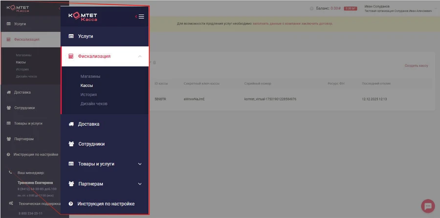 После входа в личный кабинет вы автоматически попадаете в раздел Фискализация -> Кассы. Слева находится список разделов. В некоторых из них есть подразделы.