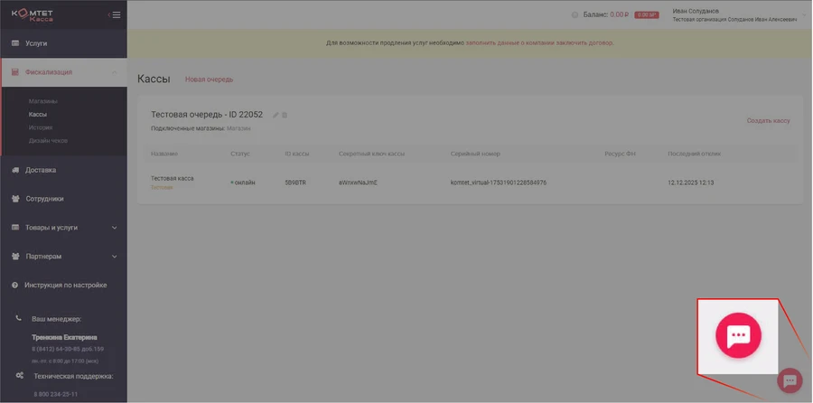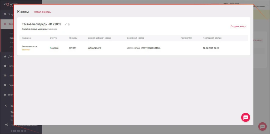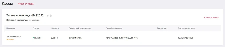 В подразделе находится информация о подключенных кассовых аппаратах. По умолчанию создается одна очередь и одна тестовая касса в ней. Если требуется, вы можете удалить кассу, а очередь отредактировать. Для каждого филиала вашего магазина, требуется отдельная очередь, чтобы развести чеки на определенную кассу.