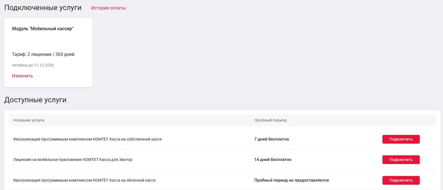 Некоторые услуги по умолчанию подключаются на тестовый период. Например услуга "Фискализация программным комплексом КОМТЕТ Касса на собственной кассе" подключается на 1 неделю бесплатно. Ниже вы можете найти список услуг, которые вы можете подключить.
