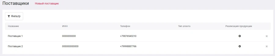 В данном подразделе создаются карточки поставщиков. В них указываются Название компании, ИНН и номер телефона. После создания, вы можете указывать данную организации как поставщика при создании нового товара.