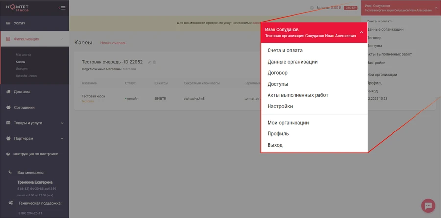 Если кликнуть по имени пользователя открывается раздел Профиль. Здесь проводятся настройки организации и профиля, а так же оплата счетов и проверка актов. Подробнее о каждом разделе расскажем ниже.