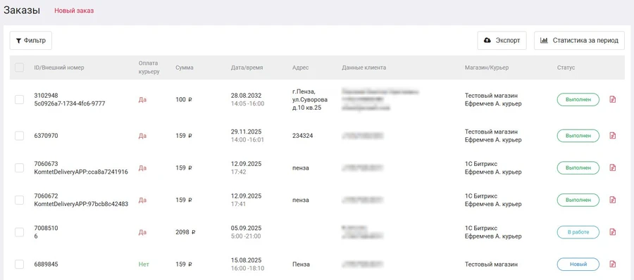 Аналогично с разделом История, есть возможность задать Фильтр для заказов, посмотреть краткую статистику по кнопке Статистика за период и выгрузить подробную информацию о заказах по кнопке Экспорт.