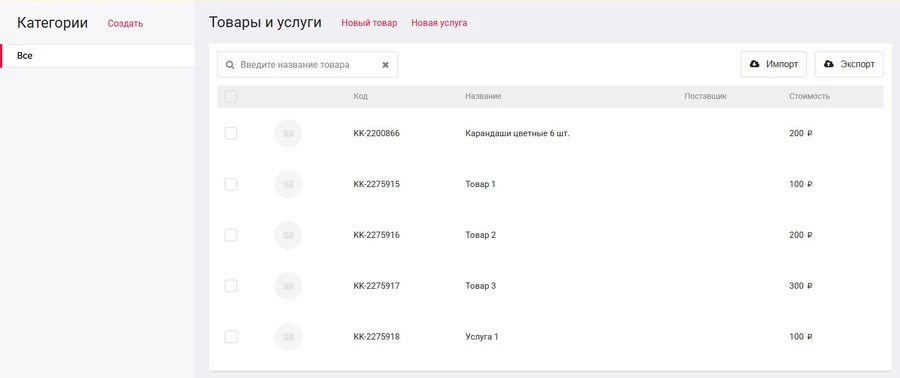 Здесь вы видите список ваших товаров и услуг, а так же категории товаров для быстрой навигации в каталоге. В подразделе реализована возможность выгрузки списка товаров и загрузка готового каталога файлом Excel.