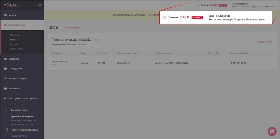 В правом верхнем углу вы видите ваш баланс, имя пользователя и название компании, в которой сейчас находитесь.