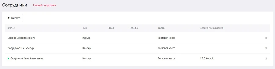Раздел предназначен для создания сотрудников для работы в мобильных приложениях КОМТЕТ Касса и КОМТЕТ Касса Курьер. Сотрудник созданный здесь не получает доступ в личный кабинет, для этого требуется добавить нового пользователя. Создавая сотрудника здесь, вы даете ему возможность пробивать чеки и проводить заказы через мобильное приложение, минуя личный кабинет.