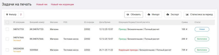 Здесь вы найдете историю ваших чеков, а так же по кнопке Новый чек или Новый чек коррекции сможете создать чек вручную. По умолчанию отображаются чеки только за последнюю неделю. В фильтре вы можете задать нужный диапазон дат, а так же другие параметры, по котором можно отфильтровать чеки. Если вам требуется статистика за выбранный период, задайте его в фильтре затем нажмите кнопку Статистика. Вы увидите количество чеков и их сумму.