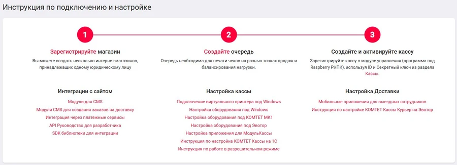 Здесь вы можете найти инструкции по настройке модулей интеграции, вашего оборудования, работы с Честным знаком, модулей для курьерской доставки.