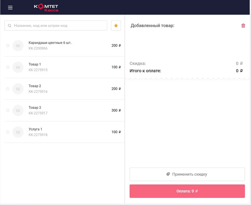 Интерфейс кассира предназначен для формирования чеков сотрудниками на розничной точке или удаленно. Он имеет упрощенный интерфейс схожий с приложением КОМТЕТ Касса. В нем из заранее подготовленного каталога сотрудник может собрать корзину и сформировать чек на указанные товары. Для доступа к интерфейсу требуется создать Сотрудника и подключить Модуль "Мобильный кассир" в разделе Услуги.