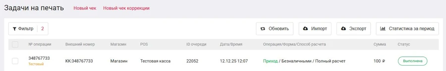 - Если он проходит проверку, операция переводится в статус Выполнена. Если чек сформирован неправильно, статус изменится на Ошибка. Внутри операции вы можете увидеть описание ошибки